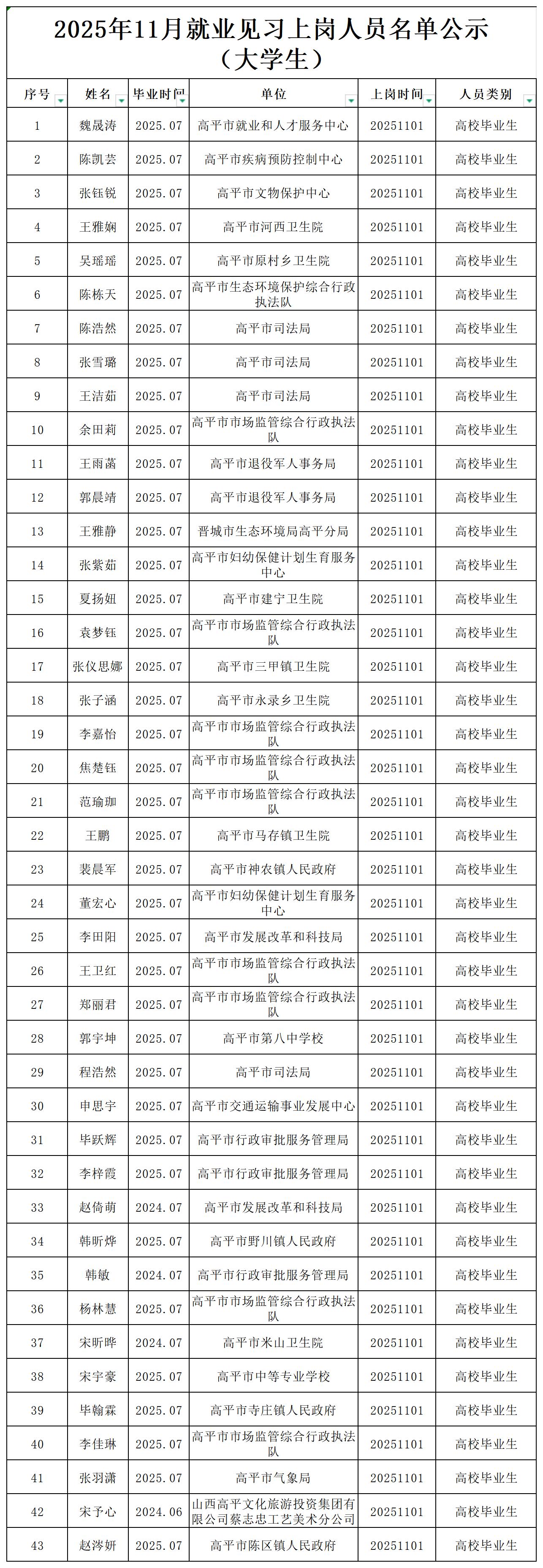 2025年11月就业见习上岗人员名单公示(高校毕业生)