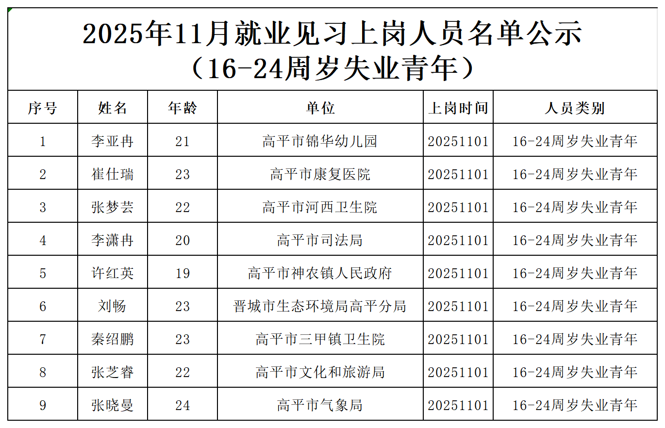 2025年11月就业见习上岗人员名单公示(16-24周岁失业青年)