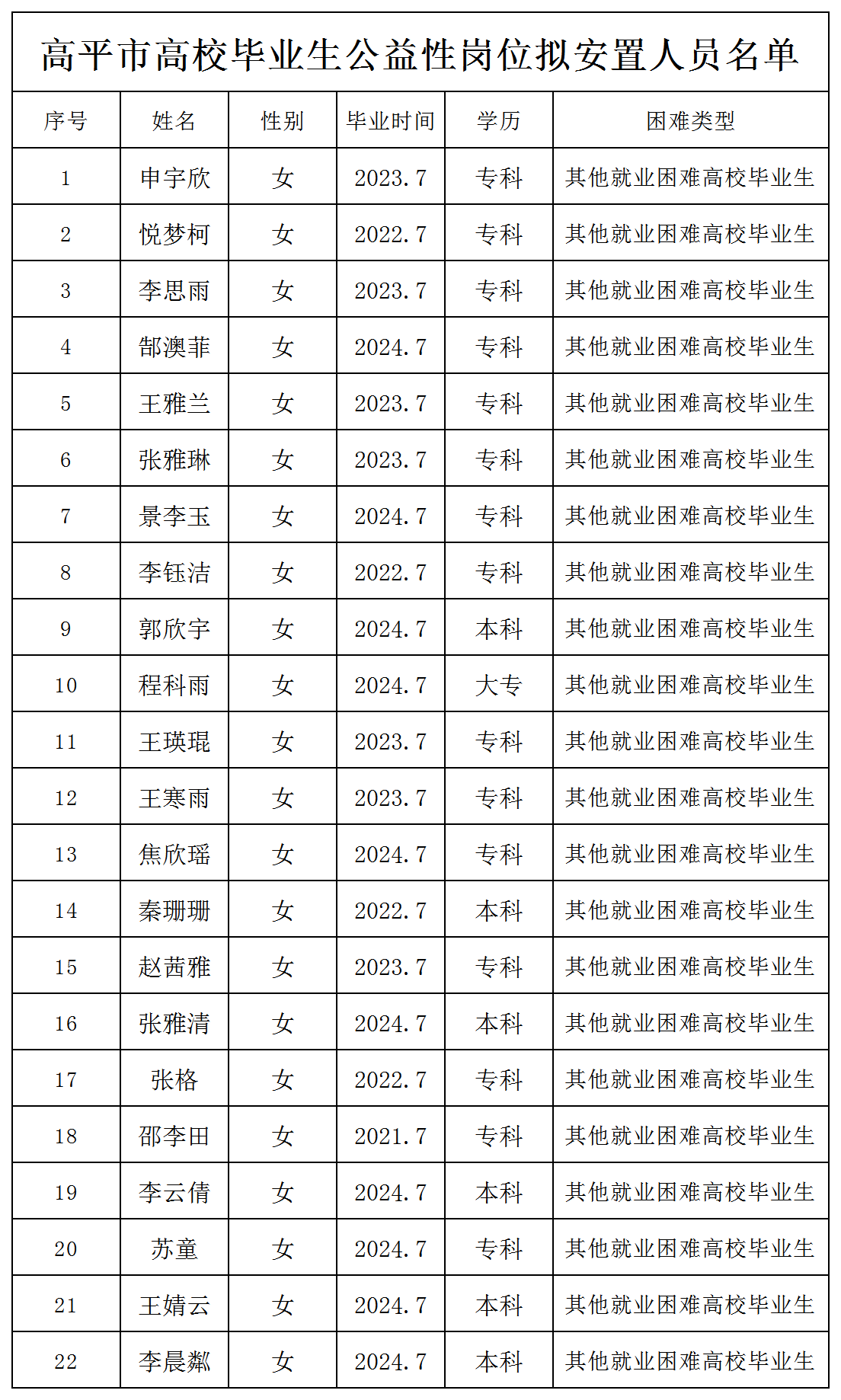 根据《关于做好公益性岗位开发管理有关工作的通知》(人社部发〔2019〕124号)、《关于印发<山西省公益性岗位开发管理暂行办法>的通知》(晋人社规字发〔2025〕3号)、《关于做好 “实施就业优先战略,强化就业困难群体就业帮扶” 民生实事实施方案》(高人社字〔2025〕11号)文件精神及相关就业政策,经报名、资格审查、体检等环节,现拟安置申宇欣等22名人员从事高校毕业生公益性岗位工作,安置名单附后。