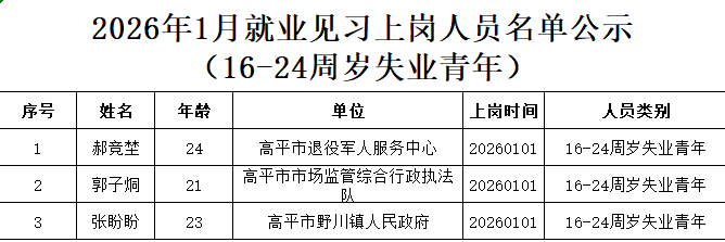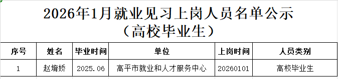 2026年1月就业见习上岗人员名单公示